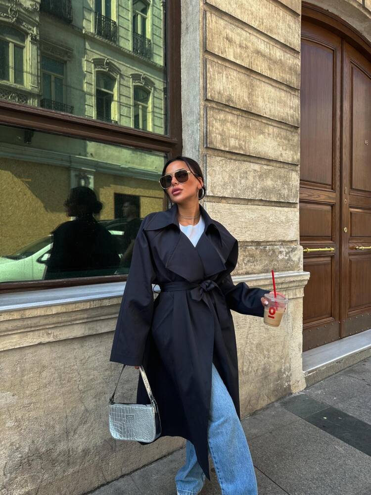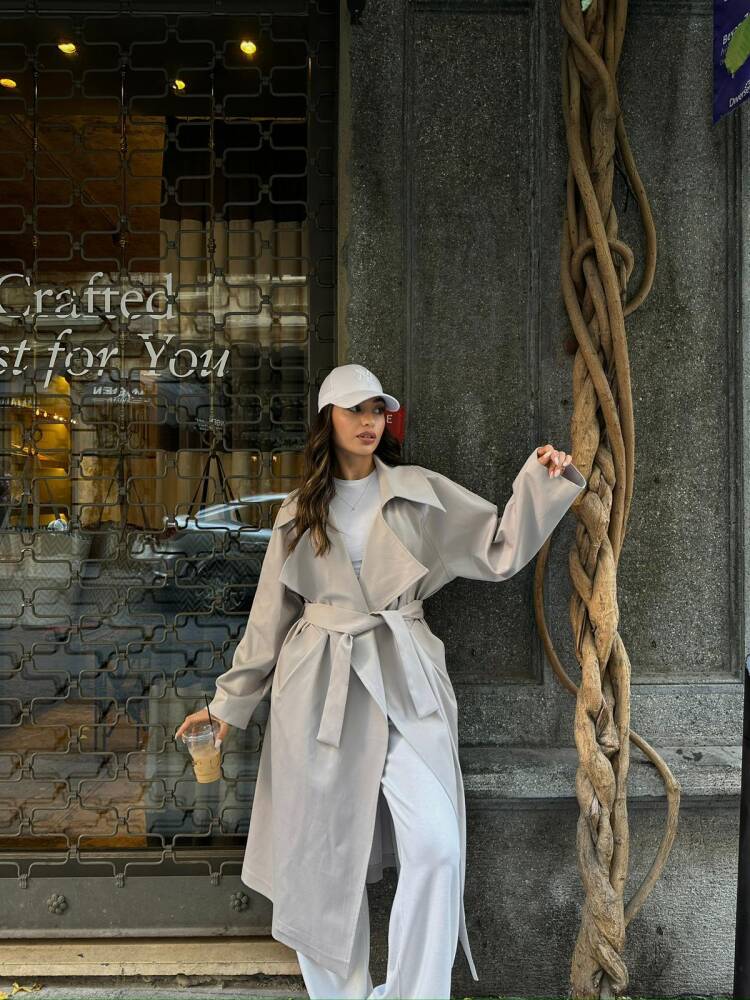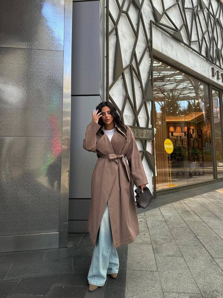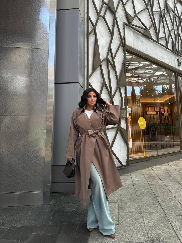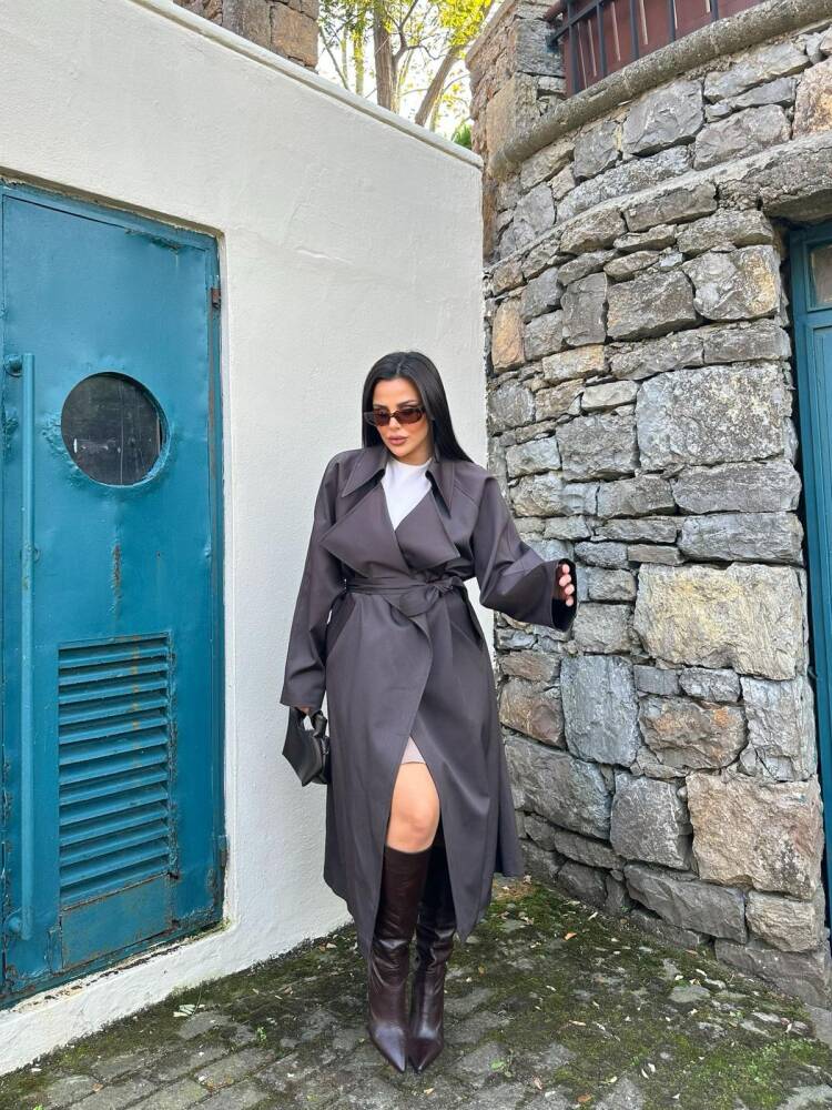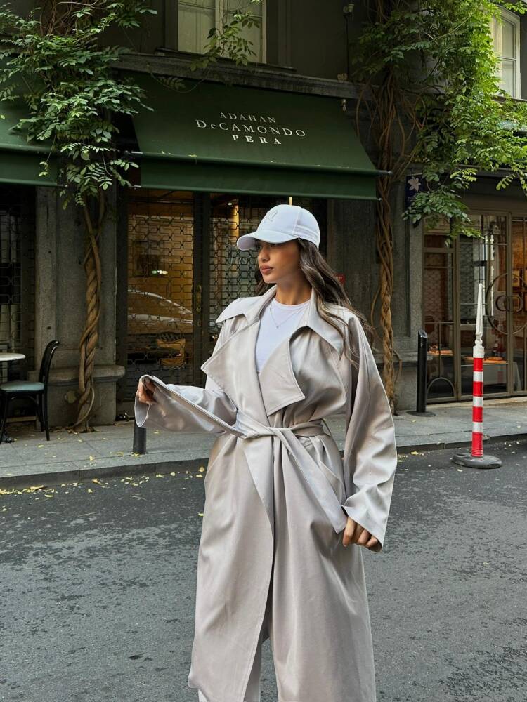Oversize kalıp, kruvaze yaka, standart kol, belden kuşaklı, cep detaylı, astarsız, Standart beden